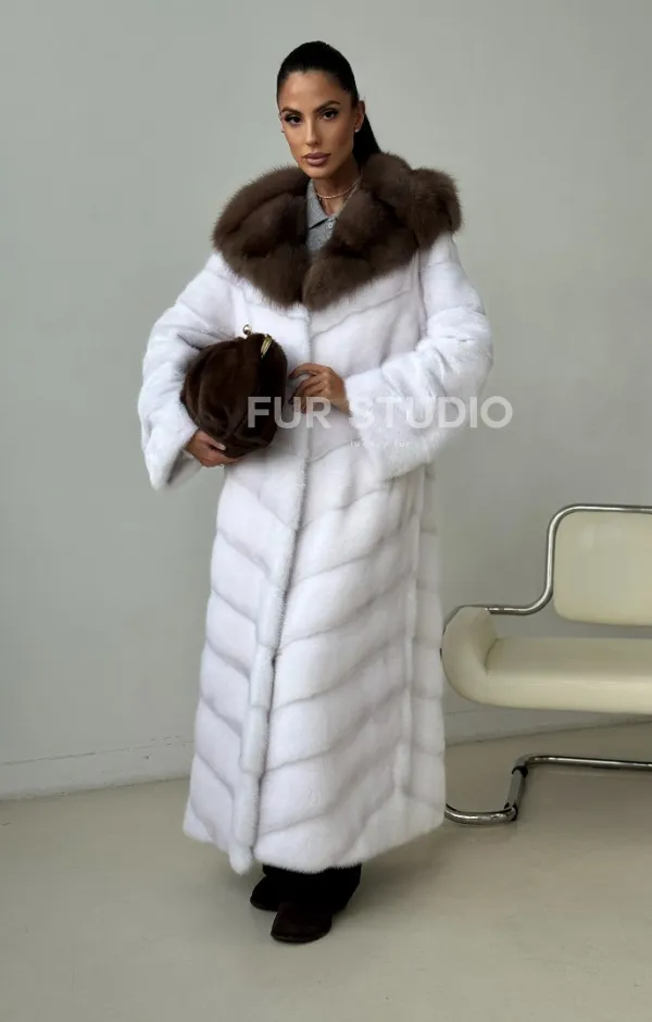 Белая норковая шуба с куницей капюшон 102390
