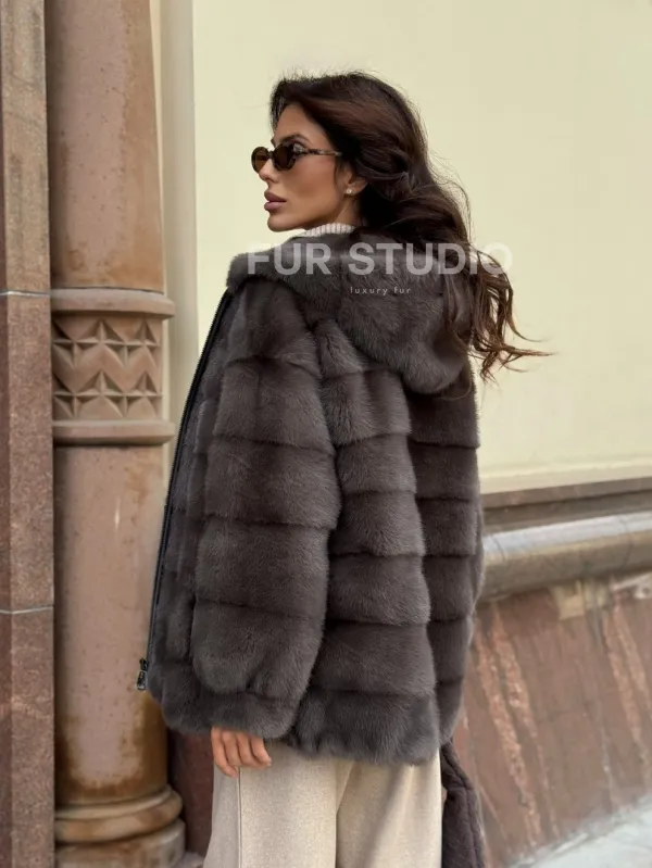 Материал выбранной модели — аукционная норка, доступна в цвете серый. Куртка предлагается в разнообразии размеров, от S до XL, а ее длина составляет 65-70 см, что выигрышно подчеркивает вашу фигуру. Этот вариант идеально подходит для тех, кто ценит роскошь и утонченность натуральных материалов.