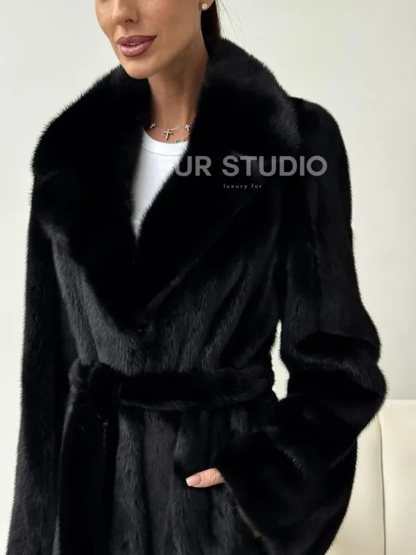 Черная норковая шуба с поясом 102453
