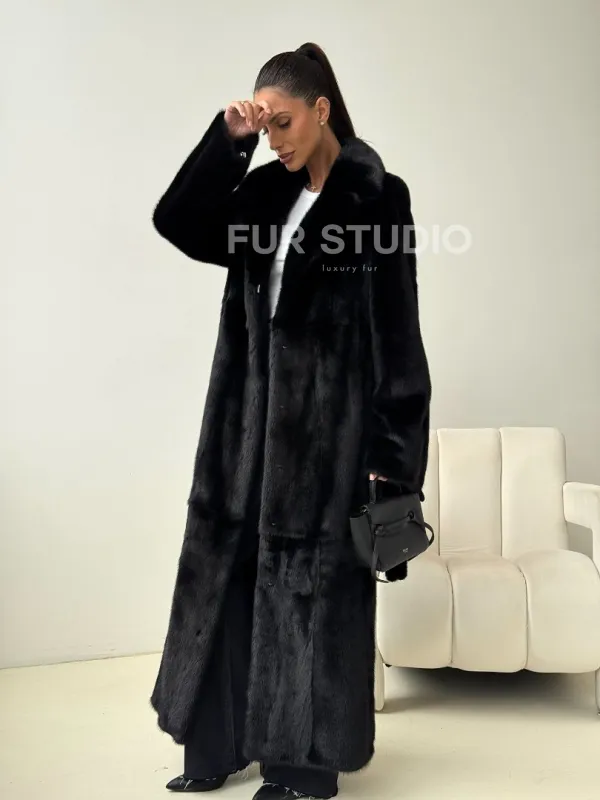 Мех данной шубы аукционная норка , цвет черный. Предлагается в размерах от 42 до 50. Длина модели 125-130 см, что выгодно подчеркивает фигуру девушек. Эта модель идеально подойдет для девушек и женщин, предпочитающих роскошные натуральные меха.
