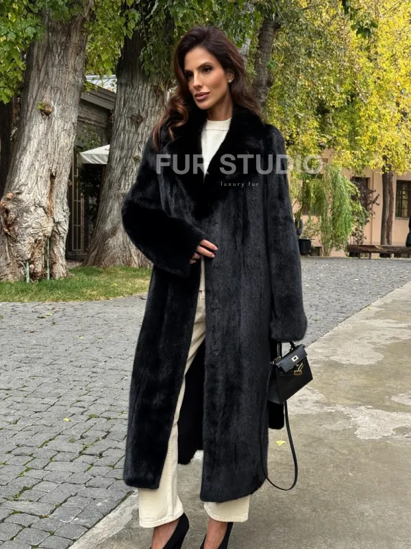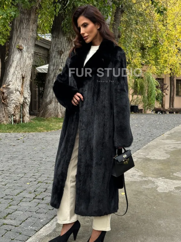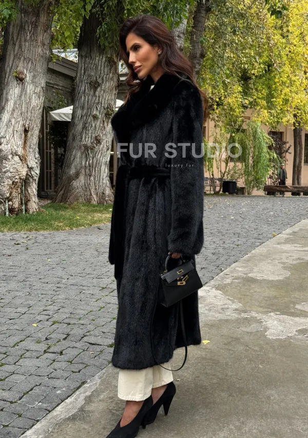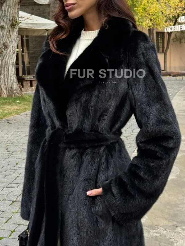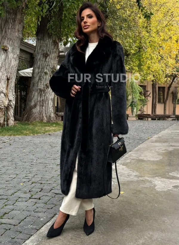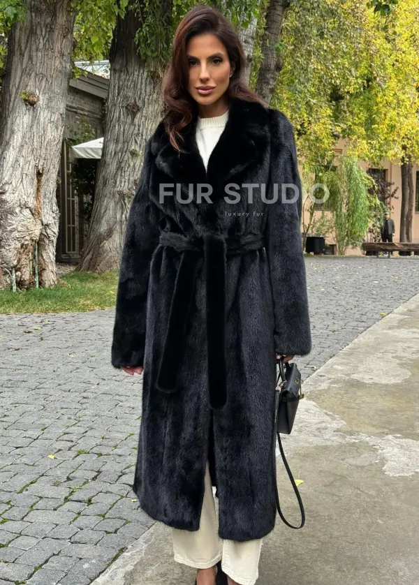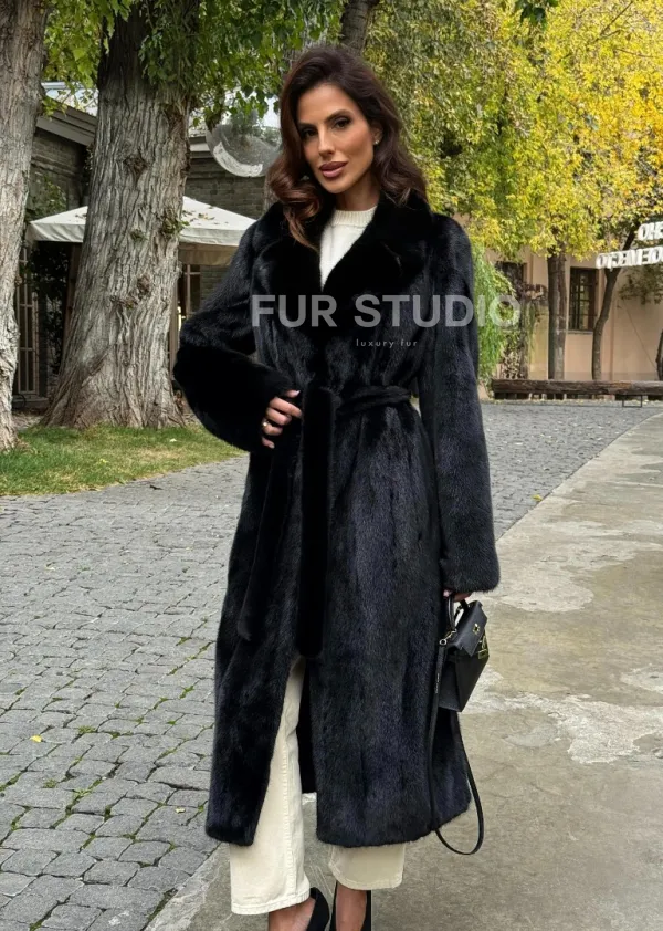 Мех данной шубы аукционная норка , цвет черный. Предлагается в размерах от 40 до 54. Длина модели 115-120 см, что выгодно подчеркивает фигуру девушек. Эта модель идеально подойдет для девушек и женщин, предпочитающих роскошные натуральные меха.