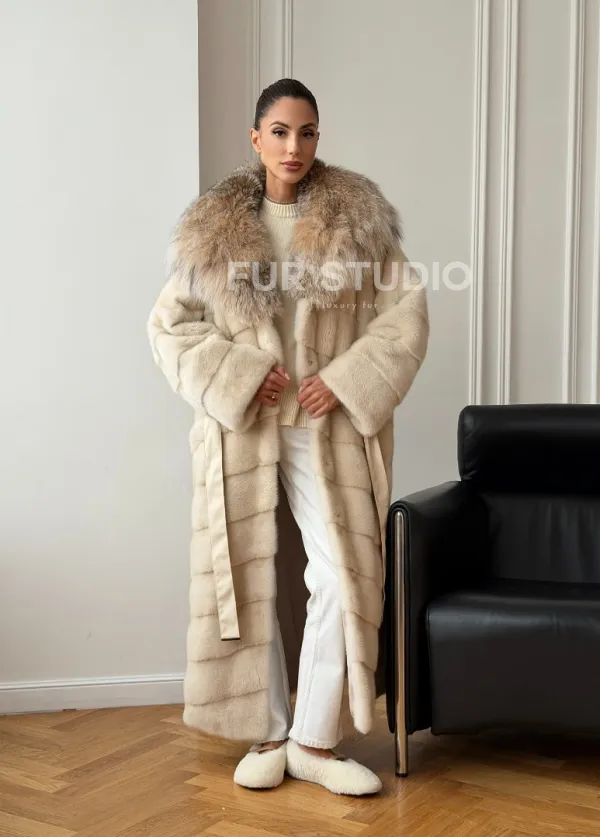 Мех данной шубы аукционная норка, цвет бежевый. Предлагается в размерах от 42 до 52. Длина модели 125-130 см, что выгодно подчеркивает фигуру девушек. Эта модель идеально подойдет для девушек и женщин, предпочитающих роскошные натуральные меха.