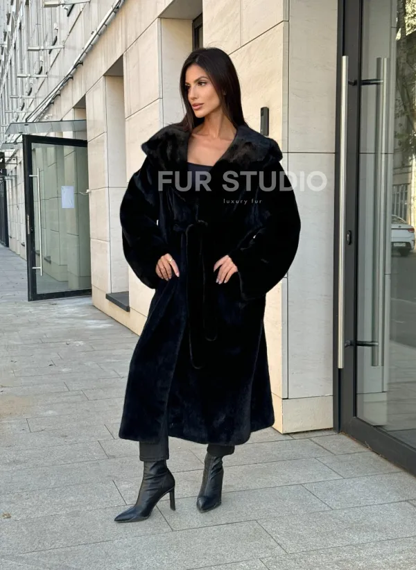 Мех данной шубы норка Blackglama , цвет черный. Предлагается в размерах от 42 до 52. Длина модели 120-125 см, что выгодно подчеркивает фигуру девушек. Эта модель идеально подойдет для девушек и женщин, предпочитающих роскошные натуральные меха.