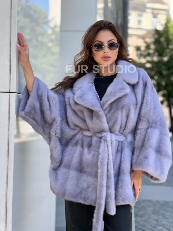Нежный мех бережно согреет владелицу в любую непогоду. Широкие рукава не сковывают движение. Оптимальная длина удобна при носке. Меховой пояс очертит талию и создаст силуэт песочных часов. В изделии вы будете выглядеть женственно и роскошно. Образ дополнит статусная сумочка. Купить норковое пончо из меха голубой норки может женщина, у которой безукоризненный вкус и она любит выглядеть роскошно.