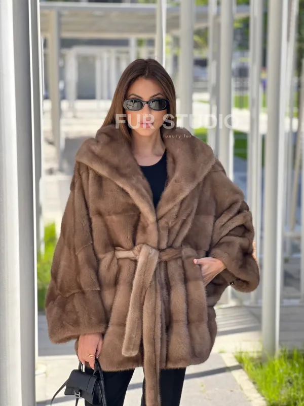 Норковое пончо с капюшоном в цвете пастель 100129