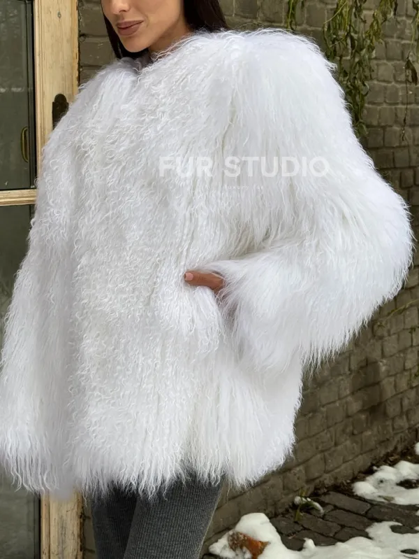 Шуба белая из меха ламы без воротника 101437
