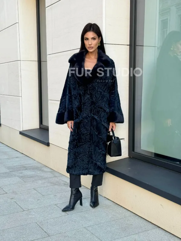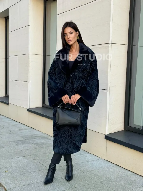 Шуба из каракуля Indigo Blue с отделкой из меха норки, фасон кокон 101105