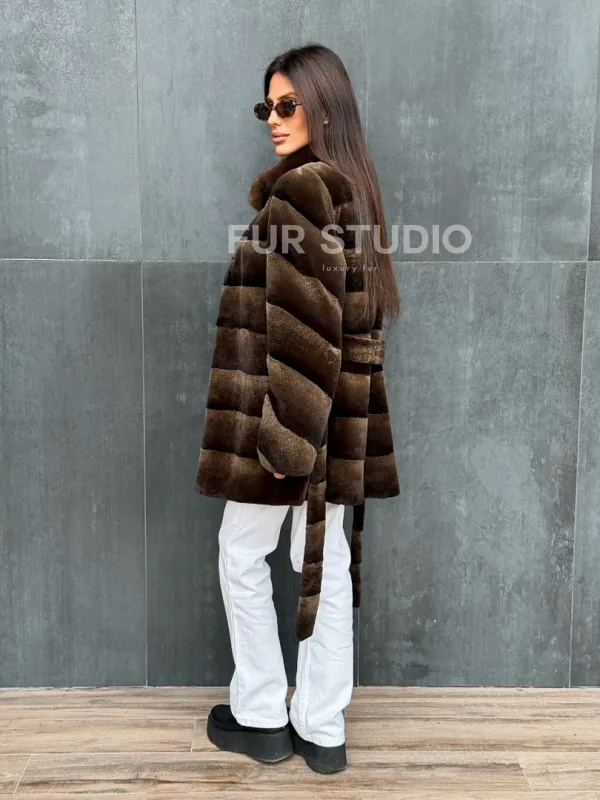 Мех данной шубы кролик рекс , цвет коричневый. Предлагается в размерах от 40 до 42. Длина модели 75-80 см, что выгодно подчеркивает фигуру девушек. Эта модель идеально подойдет для девушек и женщин, предпочитающих роскошные натуральные меха.