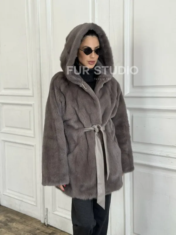 Шуба норковая с капюшоном роспуск - цвет графит 100862