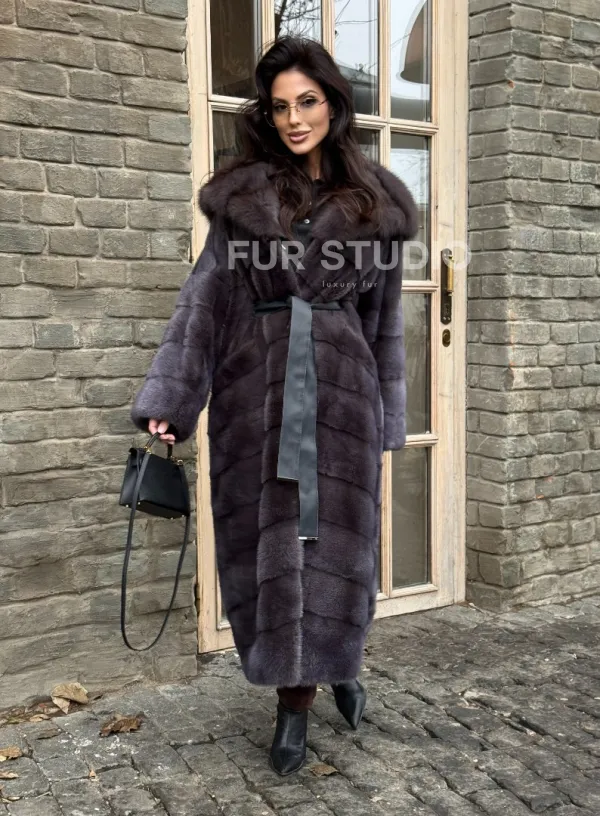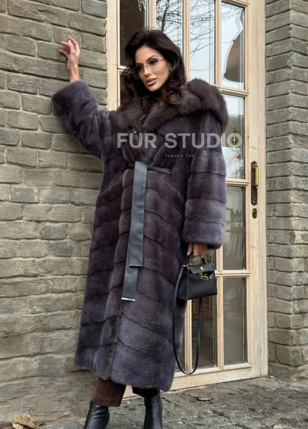 Удлиненная шуба из меха норки с капюшоном куница 101425